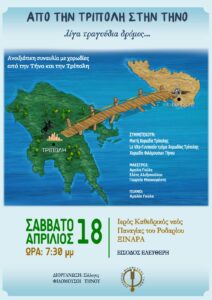 ΛΙΓΑ ΤΡΑΓΟΥΔΙΑ ΔΡΟΜΟΣ Από την Τρίπολη στην Τήνο Ο Σύλλογος «Φιλόμουσοι Τήνου» με χαρά διοργανώνει Ανοιξιάτικη συναυλία. Δύο χορωδίες από την Τρίπολη και η