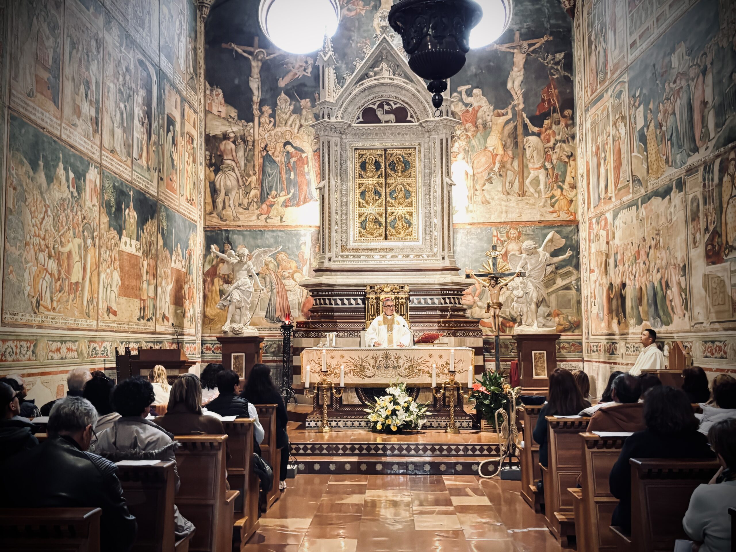 Τη Δευτέρα 17 Νοεμβρίου, το «Προσκύνημα της Ελπίδας» που διοργανώνει η Αρχιεπισκοπή μας στο πλαίσιο του Ιωβηλαίου Έτους, συνεχίστηκε έξω από τη Ρώμη και συγκεκριμένα στον καθεδρικό ναό του 14ου αιώνα στην μικρή πόλη Ορβιέτο της Ούμπρια (κεντρική Ιταλία). Ο ναός είναι αφιερωμένος στην Μετάσταση της Θεοτόκου (Santa Maria Assunta).