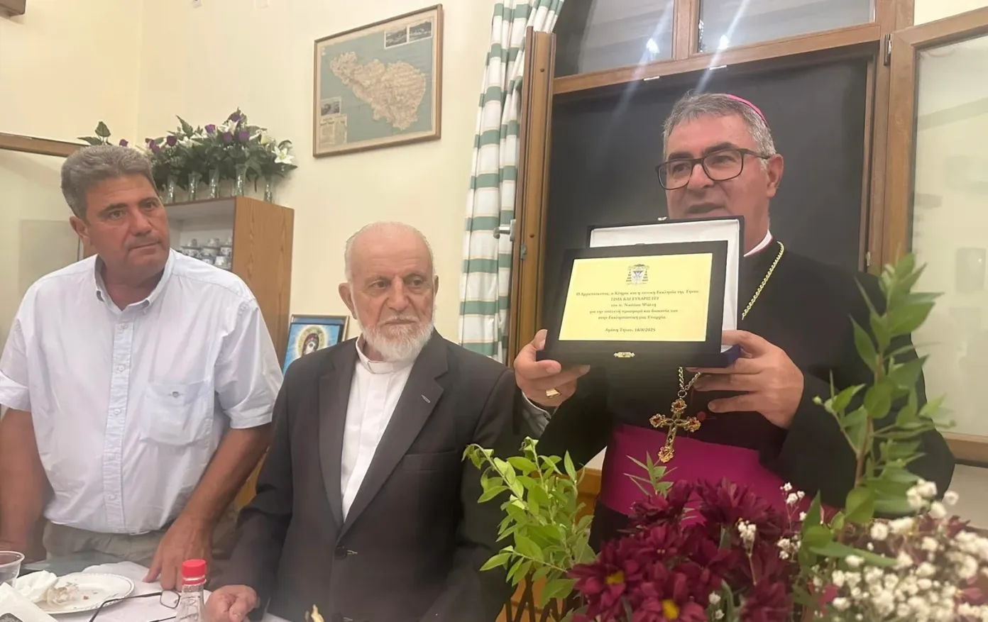 Ο Αρχιεπίσκοπος ευχαρίστησε τον Σύλλογο του χωριού και το Ενοριακό Συμβούλιο για την πολύτιμη συνεργασία τους με τον απερχόμενο εφημέριο και τους κάλεσε να συνεχίσουν με τον ίδιο ζήλο και με τον νέο εφημέριο.