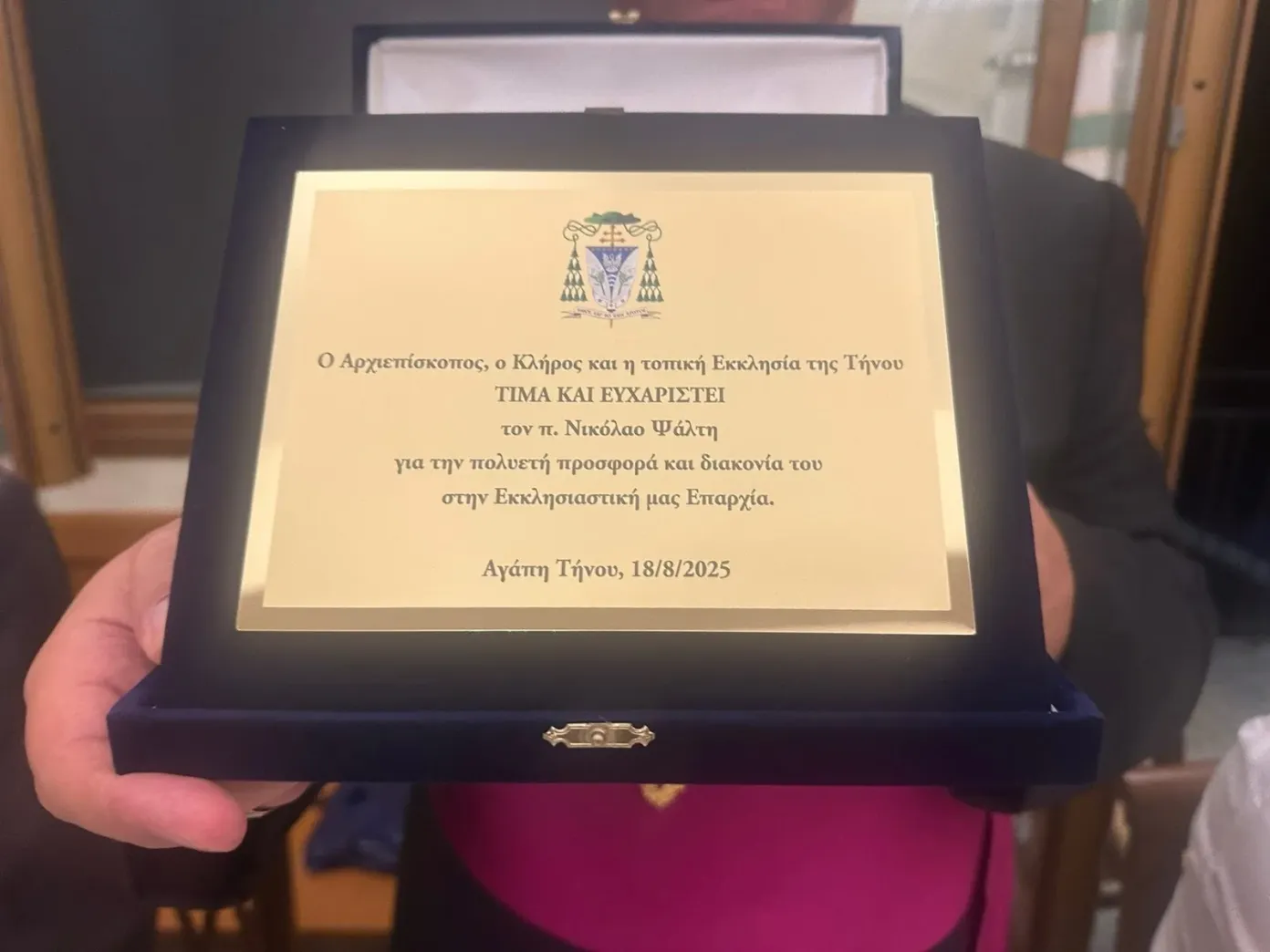 Συγκινητικά λόγια απηύθυνε και ο Αντιδήμαρχος Τήνου κ. Ιωάννης Ζαλώνης, ο οποίος αναγνώρισε και τίμησε το έργο του π. Νικολάου, ιδιαίτερα το φιλανθρωπικό, αναφέροντας πολλές από τις πρωτοβουλίες στις οποίες στάθηκε πρωτεργάτης. Ως ένδειξη αγάπης και ευγνωμοσύνης, του πρόσφερε ένα μαρμάρινο περιστέρι, σύμβολο ειρήνης και Αγάπης.