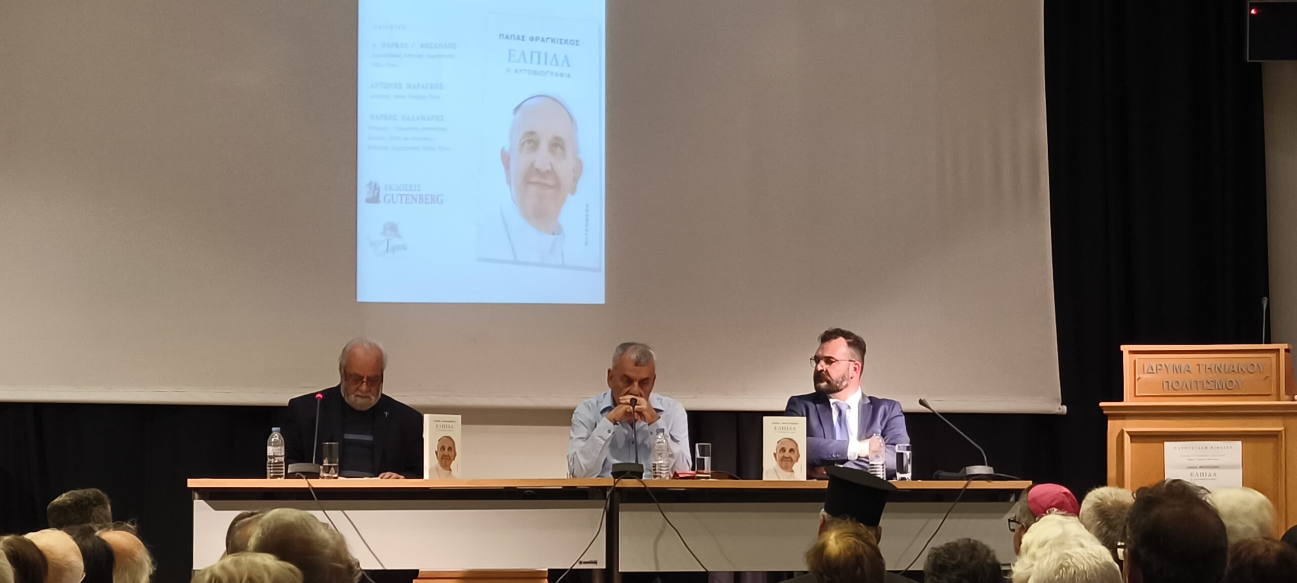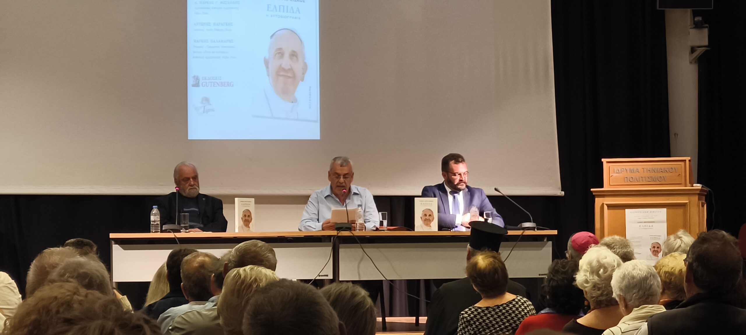 Με ιδιαίτερη επιτυχία πραγματοποιήθηκε στο Ίδρυμα Τηνιακού Πολιτισμού η παρουσίαση της αυτοβιογραφίας του Πάπα Φραγκίσκου με τίτλο «ΕΛΠΙΔΑ» (Εκδόσεις Gutenberg). Η εκδήλωση ανέδειξε τον ποιμαντικό και κοινωνικό παλμό του βιβλίου, που καλεί τον αναγνώστη να ξαναβρεί το νόημα της ελπίδας ως καθημερινή στάση ζωής: προσευχή, εγγύτητα, διάλογος, υπηρεσία προς τον συνάνθρωπο.