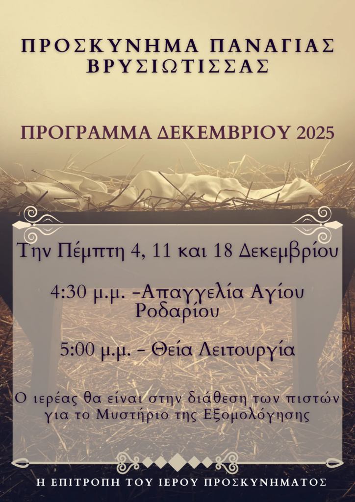 Πρόγραμμα του Προσκυνήματος της Παναγίας Βρυσιώτισσας – Δεκέμβριος 2025